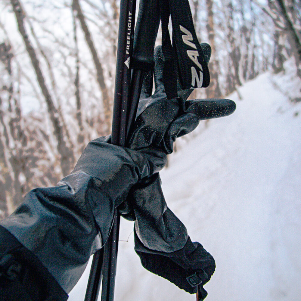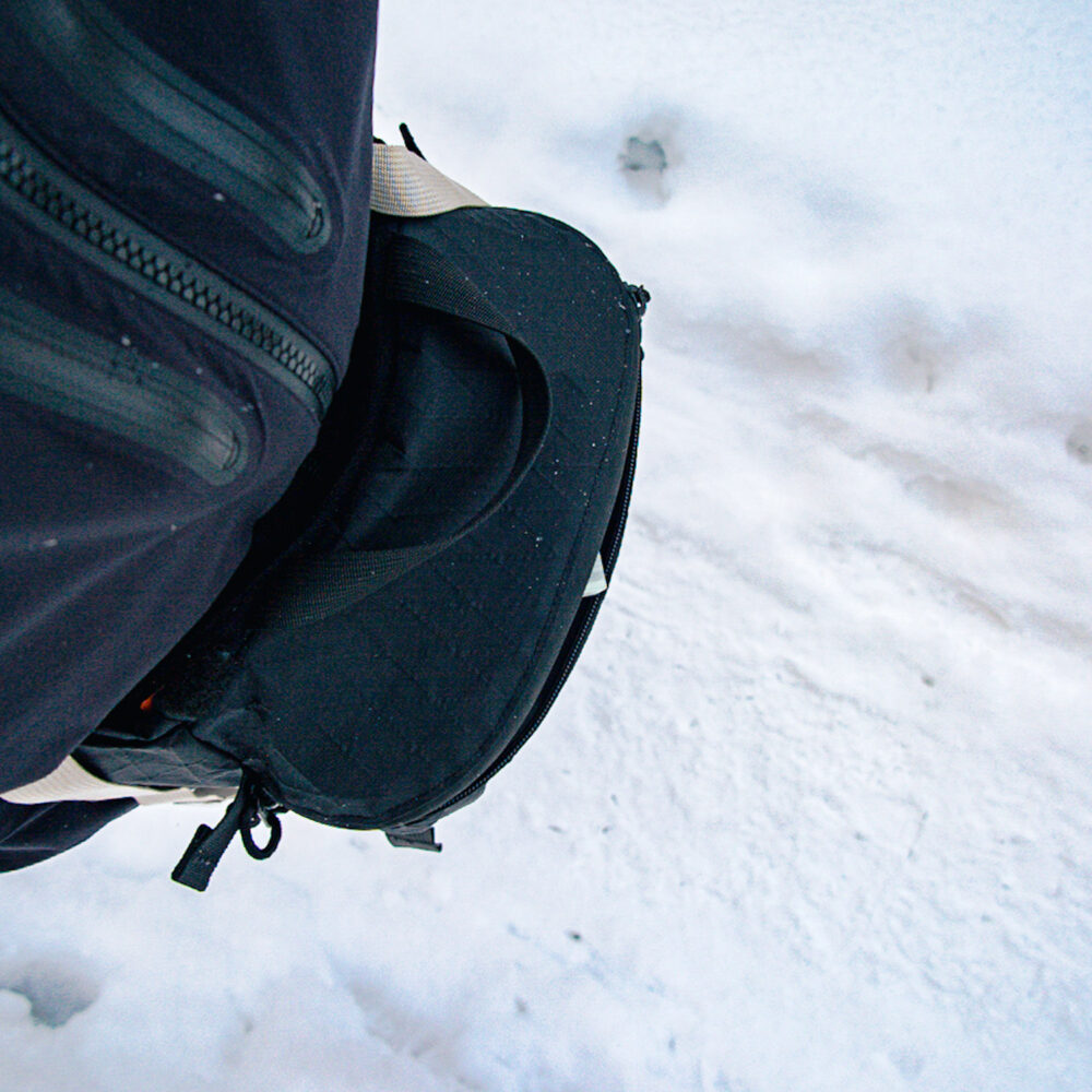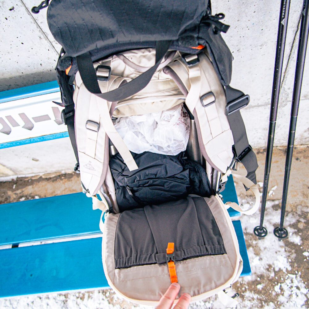 重量は2,000gとULザックとは程遠いけど、フレームがガシッと入っていて背負心地はなかなかよい。メインとアバランチギアポケットがロールアップ式なのはちょっとクセありだけど、慣れるとなんてことないかな?あと、サイドポケットが無いからストックの固定はどうしよう…(新モデルはアバランチギアポケット横にジッパーが付き、サイドポケット有にアップデート)。