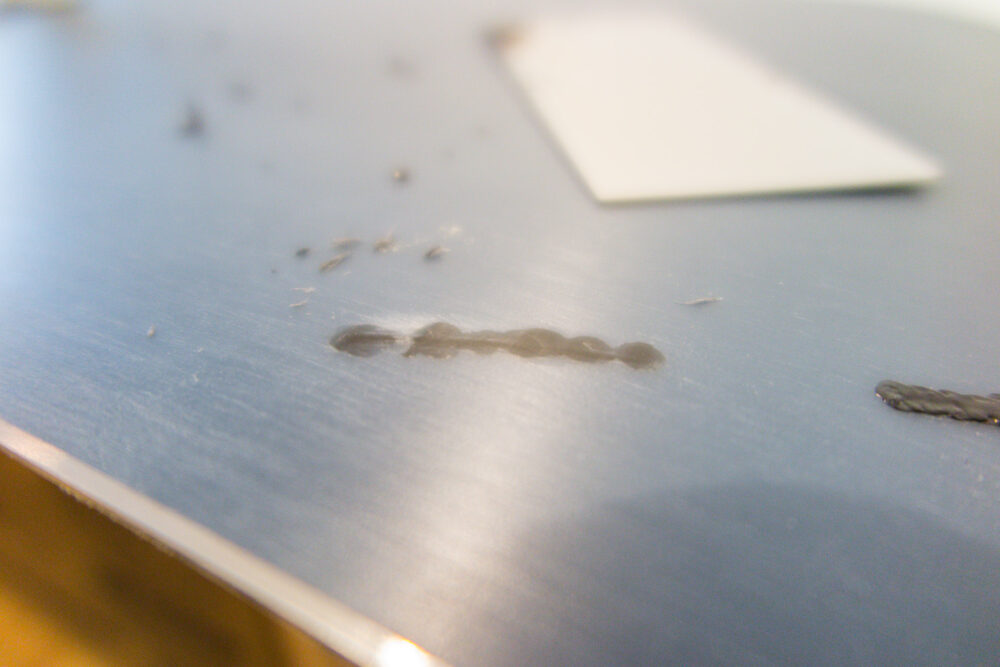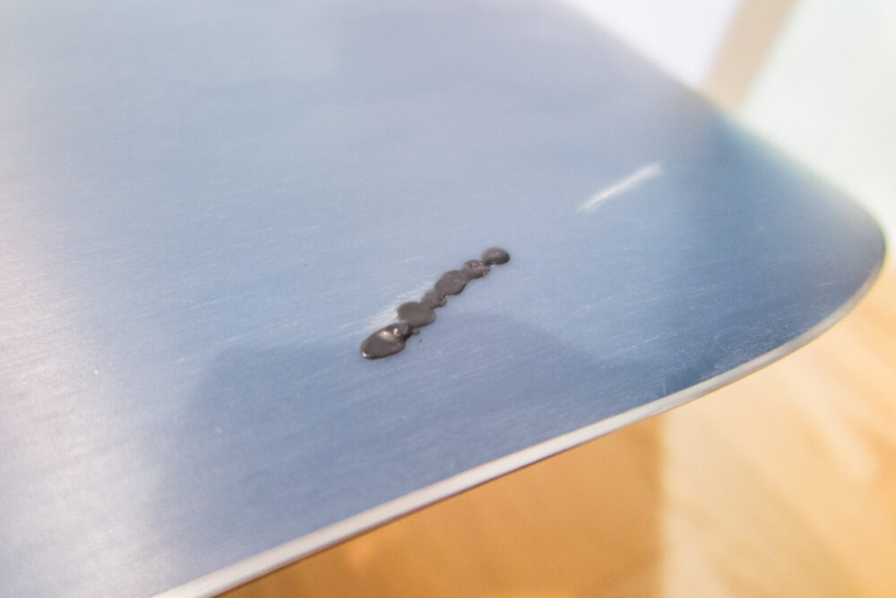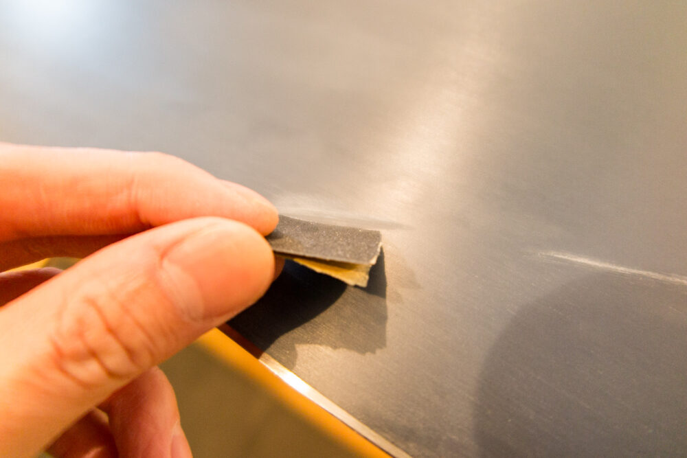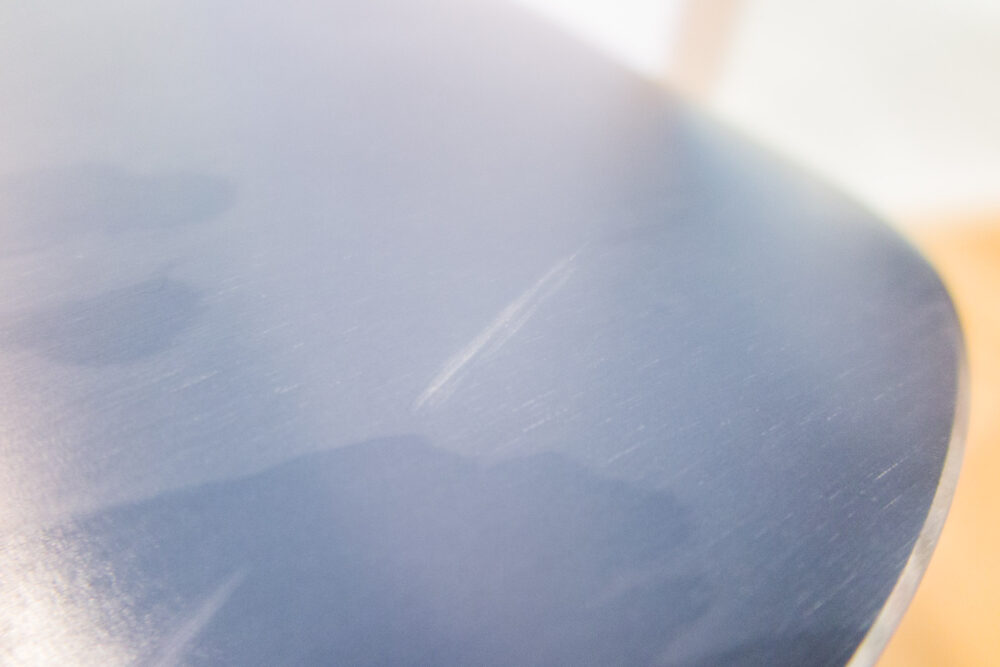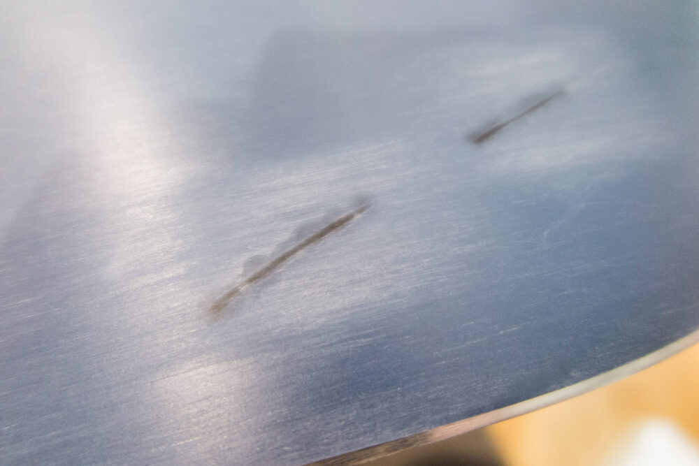 初めての傷修復なので小さめのところだけやってみることにする。こちらの傷は1mmぐらいの窪みが3cmぐらいの長さになってる(これがもう一箇所ある)。