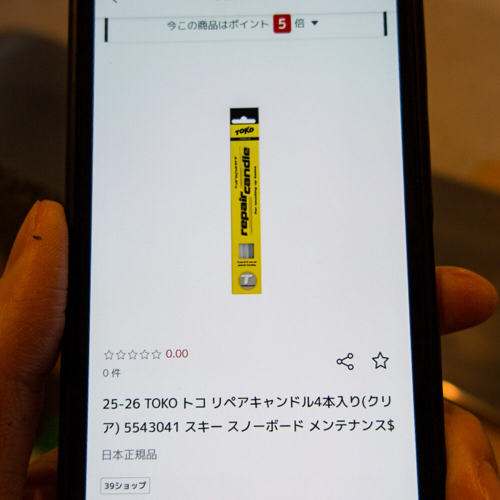 購入したリペアキャンドルはこちら。Toko(スイスのリペア用品メーカー🇨🇭)の黒いやつ。ヨドバシ.comで¥1,600ぐらいした。国内メーカーのガリウムなら¥600ぐらいで手に入るんだけど、ヨドバシ.com(というか石井スポーツ)じゃ取り扱い無かったんよな〜。