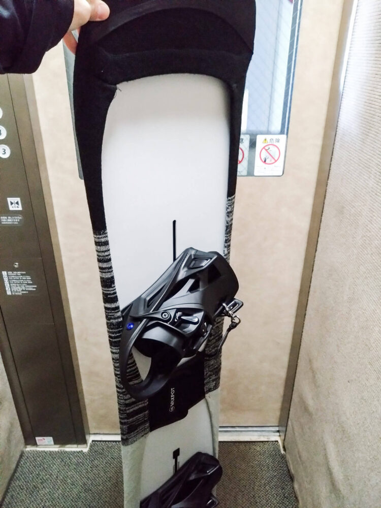 ボードはソールカバーでエッジさえ隠しておけばいいもんね。混雑する電車・バス内でデカいザックは邪魔だから荷物はスーパー最小限にした。こんな感じ👇️